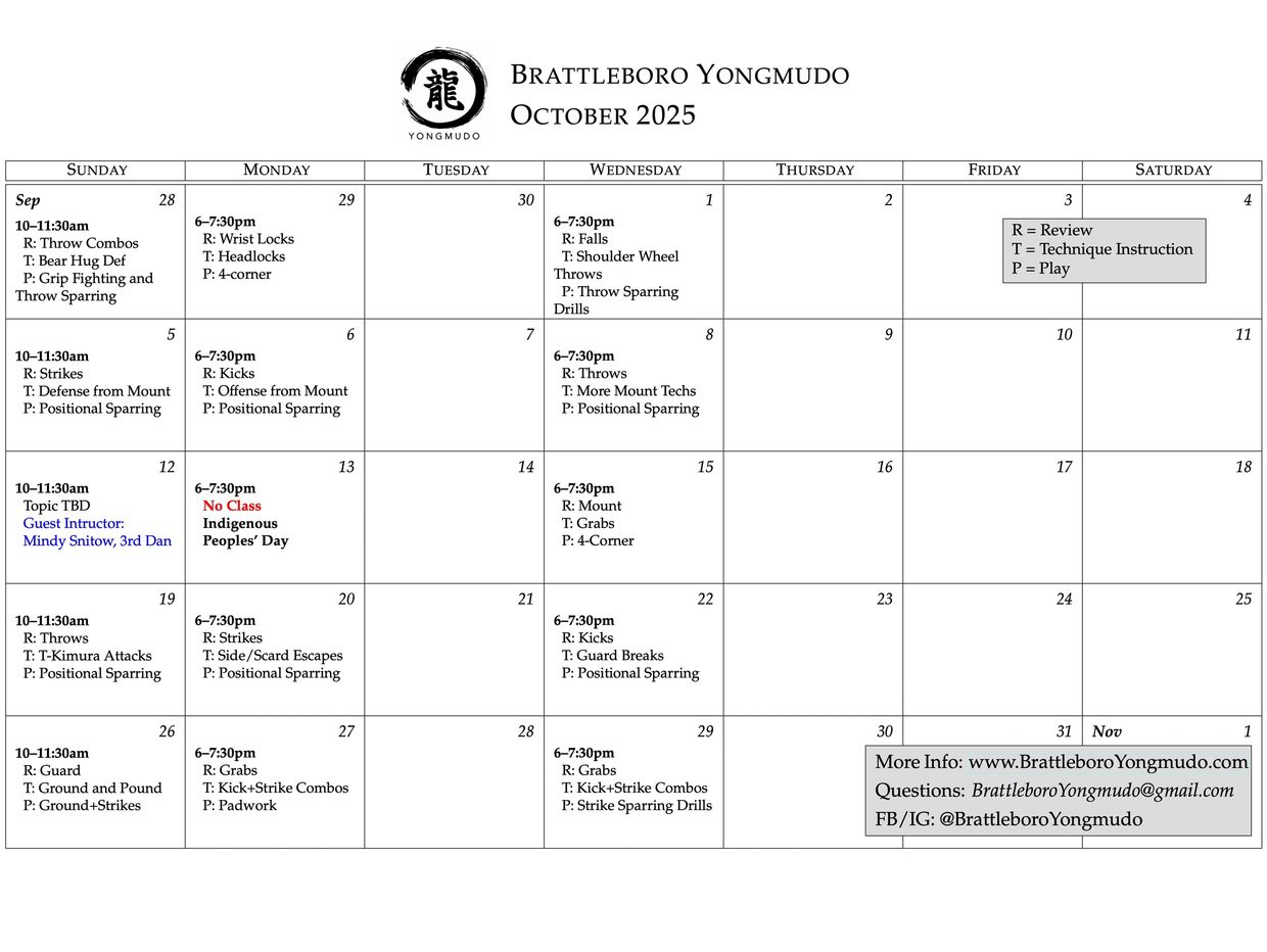 All Yongmudo classes - Sun 10-11:30am, Mon 6-7:30pm, Wed 6-7:30pm